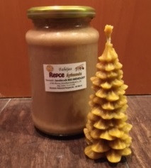 Karácsonyi csomagunk 50 dkg fahéjas repcekrémmézet és egy viaszgyertyát tartalmaz.
