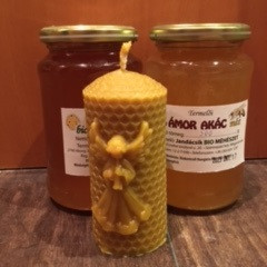 Karácsonyi csomagunk két darab 50 dkg kiszerelésű biomézet (egy hárs és egy ámorakác) és egy illatos méhviaszgyetyát tartalmaz.